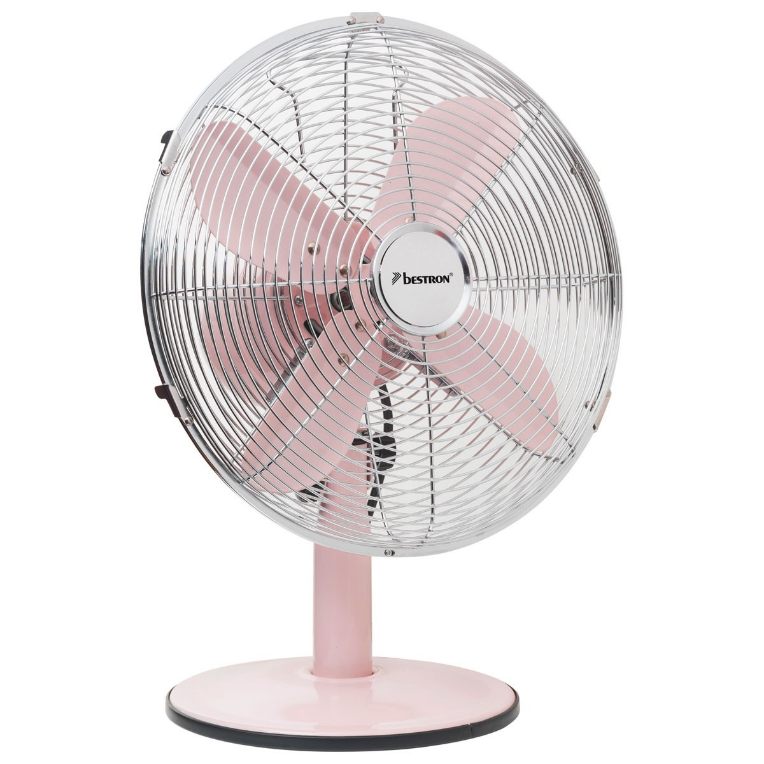 Bestron Tafelventilator Ø 35 cm, ventilator met 3 snelheidsstanden & 75° draaifunctie, 35 Watt, DFT35R, kleur: roze Deze Bestron tafelventilator DFT35R heeft een retro uitstraling en is uitgerust met een hoogwaardig kopergewikkelde motor, dus robuust en stabiel. Door de zwenkfunctie van 75° wordt een grote luchtverplaatsing mogelijk gemaakt. De ventilator is geruisarm en een antislipvoet waardoor hij extra stevig staat. De korf is verticaal verstelbaar en heeft krachtige aërodynamische ventilatorbladen, waardoor je het lekker koel krijgt.