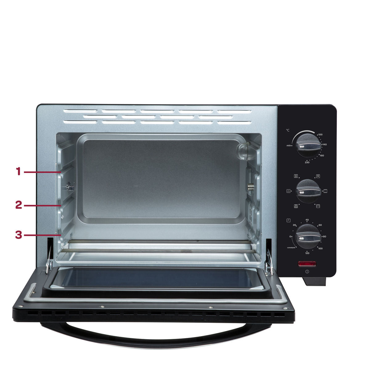 oven * hetelucht * Inhoud 30 liter * 6 kookprogramma´s * draaispit * temperatuur instelbaar tot 230 graden * timer tot 120 minuten * Bediening draaiknop * Binnenverlichting * Heteluchtoven vermogen 1600 Watt * Inclusief : 1 bakpla(a)t(en) * rooster * afm: (b x h x d): 51.8- 31.6- 40.4 cm Binnenmaat afm: (b x h x d): 35- 26- 34 cm ( 9/21 ) *
