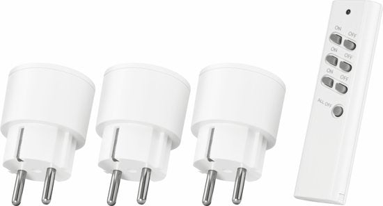 Draadloze schakelaarset met afstandsbediening en drie compacte stopcontactschakelaars voor het draadloos in-/uitschakelen van lampen/apparaten (maximaal 2300 watt)